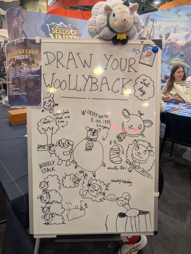 Of course there was a special guest at the booth as well all weekend. Hank 2 finally managed to slip away from Lokinox and traveled to Germany alongside the Equinox crew. Sweorkie may have assisted his escape plan and he was in attendance all weekend. Hank 2 was very active all weekend, getting up to all sorts of mischief and making a load of new friends over the fair. To celebrate his attendance at the event, players were invited to draw their own Woollyback on a board. There were a variety of fun Woollyback drawings made over the entire event!
