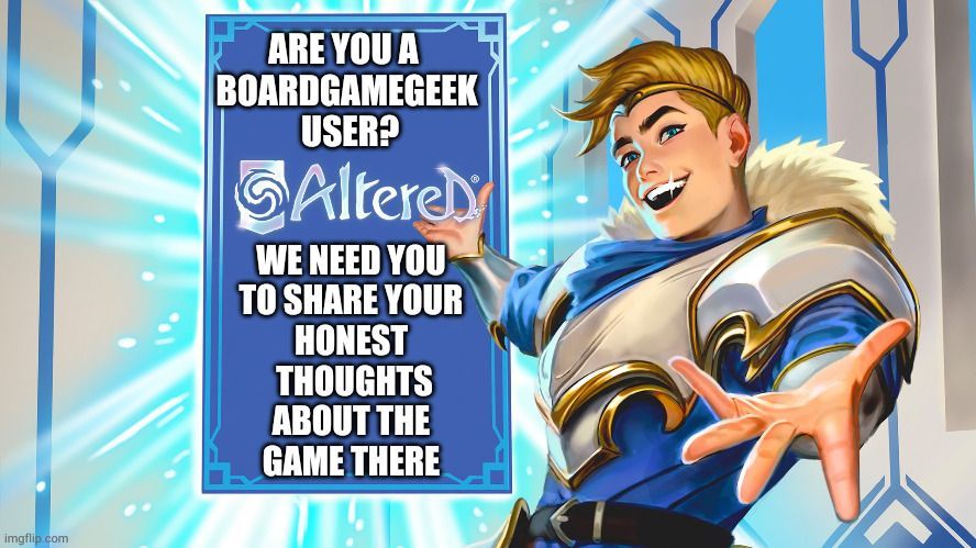 Beyond your financial contributions in stores or on Gamefound, you can also help spread the word about Altered. To do so, come and contribute to BoardGameGeek, THE international reference site for board games. This platform is an excellent showcase for reaching an audience that is a good target for Altered (Gamefound and beyond). There are several actions you can take to help: