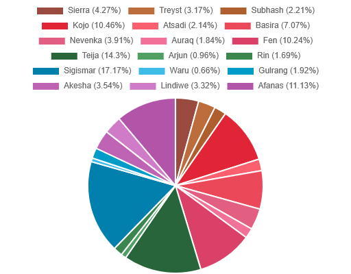 The month’s changes weren’t enough to make any major shifts to the distribution from the start of the season. Sigismar still holds almost exactly the same lead from where he stood in March, with Teija and Afanas about one percent apart in second and third, respectively. Fen and Kojo continue to split the single percent between them in fourth and fifth. Basira maintains sixth and Sierra holds onto her grip in seventh against Lindiwe in eighth.