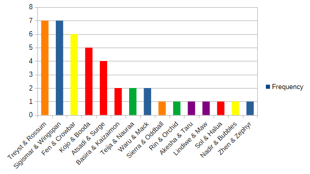 Treyst’s pressure was enough to take back the season lead from Sigismar, even by a narrow margin. The rest of the field started to spread out a bit more, with several ties from October being broken. Kojo might not have been in the top three for November alone, but he’s still in third for the season, again at the head of the original Bravos contingent with Basira and Atsadi. Fen made quick progress past several other heroes to tie in fifth, with both Teija slowing pace and Sierra tumbling back. I cannot believe I’m writing this, but Waru claimed enough wins in November to remain in the season’s current Top 8.