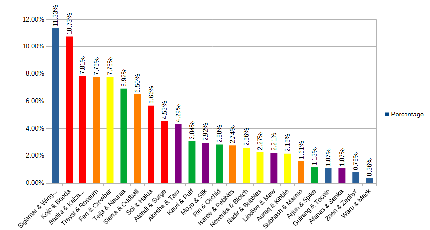 As we mentioned at the start of October’s snapshot, the new SKY heroes have fundamentally changed the math for distribution overall. Prior to the fourth set’s release, an even split across all heroes would give each about 5.5% of the distribution. Now that number is about 4.2% with 24 heroes. That number will change again with the launch of SEEDS, which will bring in an additional three heroes. Remember that shifts in distribution have more factors than just number of players choosing those heroes.