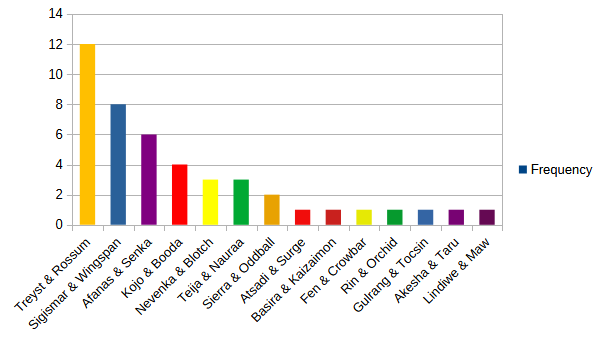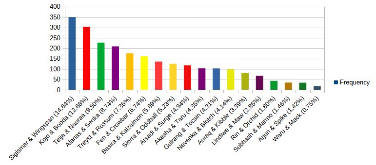 Once again, while the majority of victories went to just a handful of heroes, a total of 14 out of the 18 total picked up at least one win through the month. Subhash, Auraq, Waru and Arjun were the only heroes who missed out on at least a single gold. Also, though Treyst built up a solid bulk of wins, the others weren’t so far behind this month as to fight for scraps. Kojo and Nevenka working together pass Afanas and almost catch Sigismar, which wasn’t the case last month. And Sigismar and Afanas together still surpass Treyst’s quick rise. Even the two tied for fifth place, Nevenka and Teija (who has struggled horribly in the WFM season) working together would tie Afanas in third. With the meta cracked, it suddenly feels like there’s a wide amount of opportunity to play with.