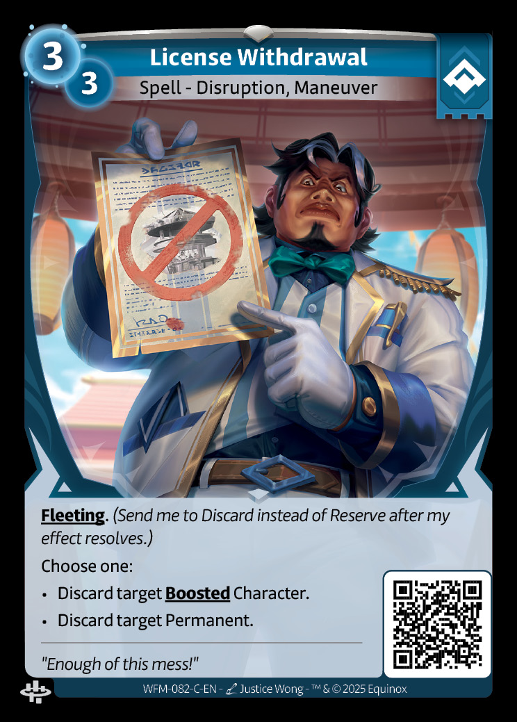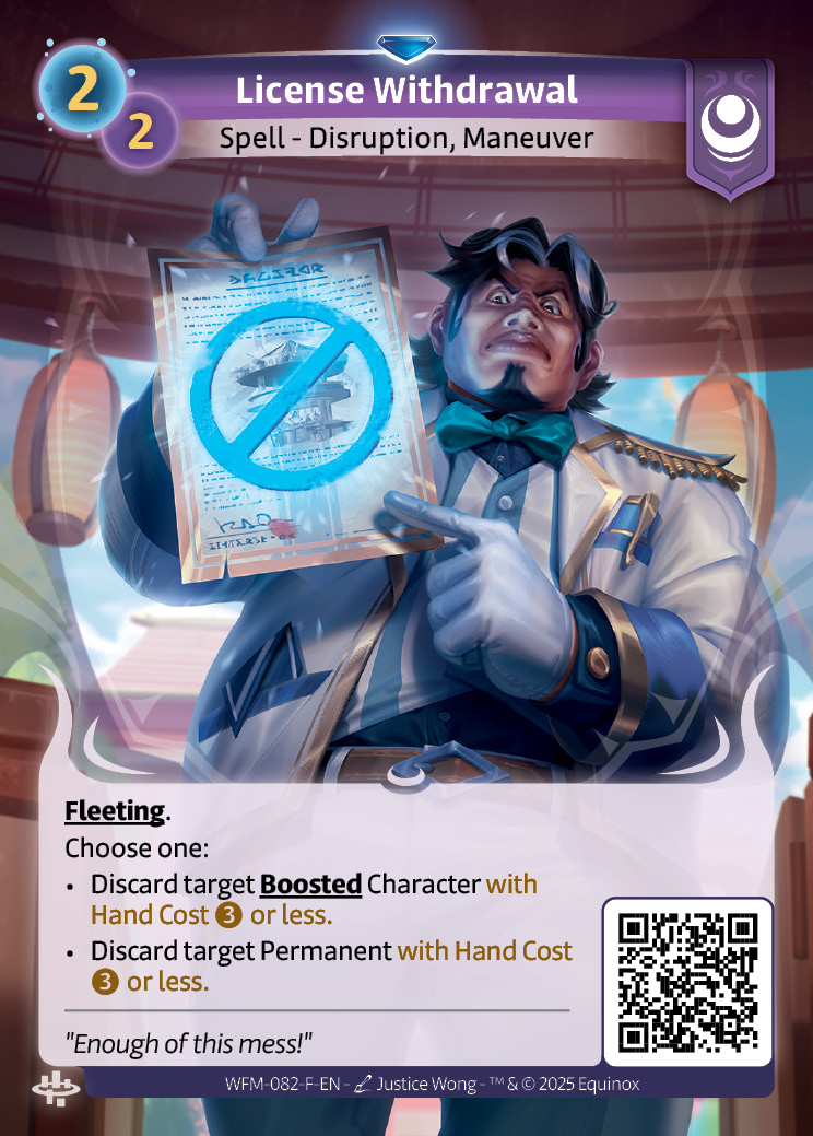 You know all those lovely counters that you’ve just doubled on your character? Well the fun police are her to ruin your fun and yes the fun police are from Ordis. The common License Withdrawal for three mana lets you either discard a boosted character or a permanent. The rare is a mini fun police card, shaving a mana off the cost but restricting the targets to costing 3 or less, which is usually about 85%-90% of most decks. The fun police spread the misery in OOF to Yzmir.
