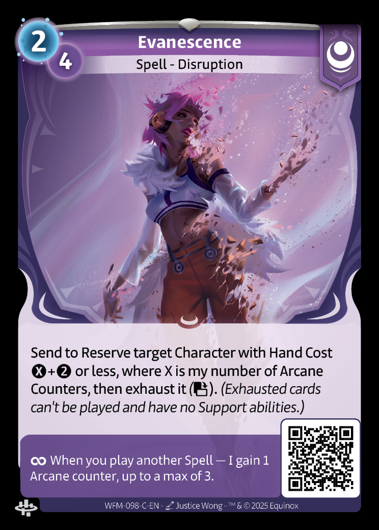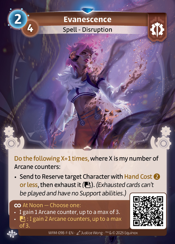 We have yet more low cost removal, this time in the base faction of Yzmir. Evanescence (also a band name) is a removal spell in the vein of Off You Go! The common can target a character with hand cost 2 or less. If you let the Arcane Counters build up on the spell in reserve it can target something with hand cost 5 or less, so the spell has some flexibility. I see Afanas being able to get those counters on this quickly and this could replace Off You Go! in that deck. The rare is more targeted at removing low cost/many-card decks. The rare can only target cards with hand cost 2 or less, but with maximum counters can get to do that 4 times. This could easily remove 4 annoying recruits or Brassbugs from the opponent’s side. The OOF card in Axiom gains counters in a different, slower way, but is otherwise the same.
