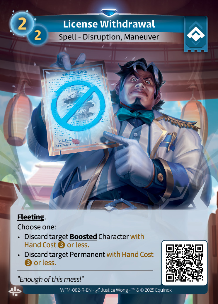 I think it’s great, to be honest. I’ve been License-Withdrawal’d so many times, but each time, yeah, if they didn’t have it, I win. So I think it’s OK, and you can still play around it. And as an Atsadi player, I don’t have that many boosts, so I’m like, “Haha, you can’t use it!” There’s still some way to work around it. Some of the removal might be a bit too up there, but it’s still a learning phase to play around them. Mostly, I’m really glad about it.