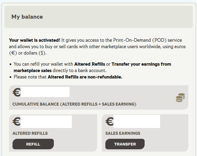 This article will show you how to manage your wallet for use on the Altered platform. The balance in your wallet will be used to buy cards and order your cards from the print on demand service.