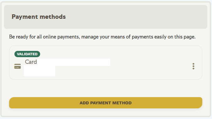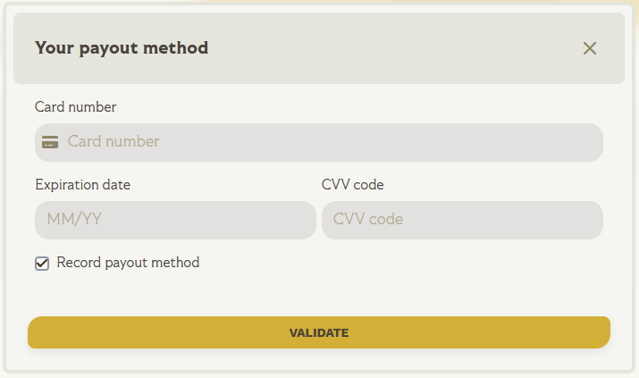 Select the only option to get to the Your payout method dialogue where you can enter the necessary data. Then click Validate to save the method: