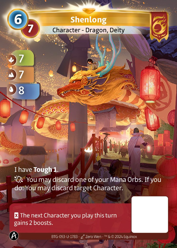 Exalted rarity cards were introduced in “Seeds of Unity”, the fifth Altered set. Unlike other cards in Altered, Exalted cards only exist in the Exalted rarity and are meant to be the staple of decks as well as give a little bit of thrill when opening packs. The number on the bottom haa an “E” in it, but the unique style of the card, putting focus on the art, makes them stand out anyway. The top center of the card shows the bronze rarity gem, to further point out the card is an Exalted.
