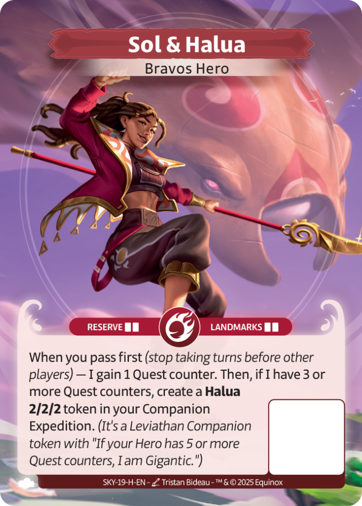 The hero for Bravos has already been revealed. She appears to be a new character and she’s an interesting design. She wants to end the days early, so this encourages having fewer plays and thus larger characters in hand. This is quite a tough challenge for such a hero as you will end up risking more against removal with this deck with fewer plays, but the reward of a free 2/2/2 each turn and later with gigantic is pretty good. I’m expecting this one to lead to a new style of play for Bravos decks.
