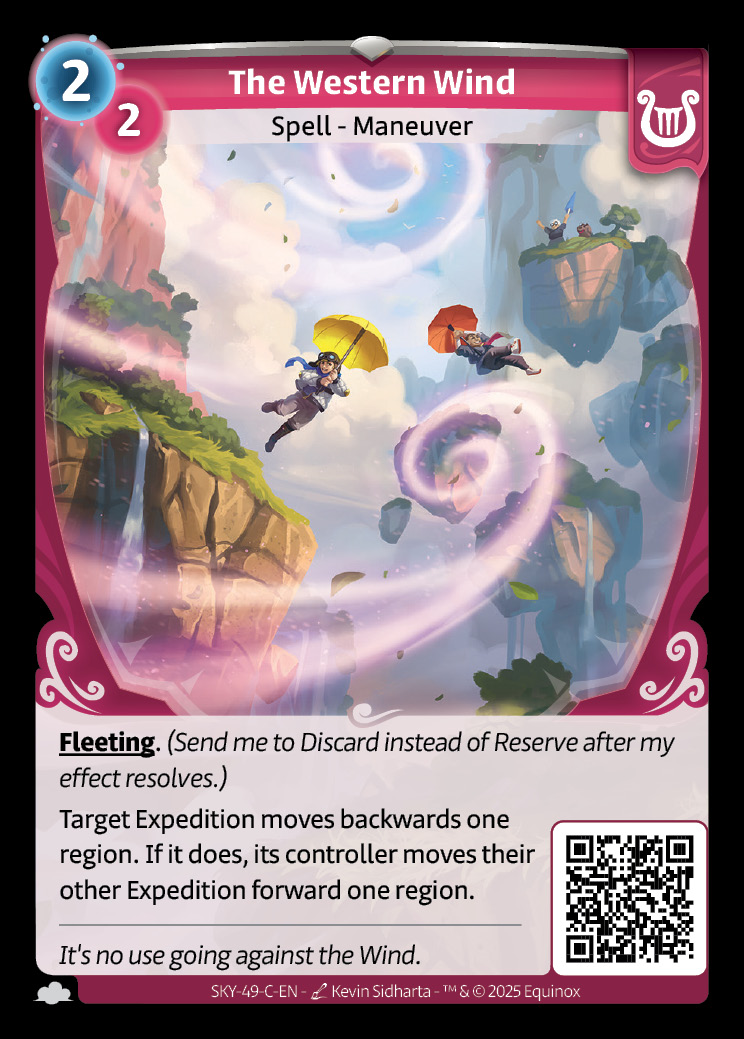 Will-o’-the-Wisp received a minor errata related to its interaction with a new Lyra SKY card, The Western Wind. Typically, the card moves one target expedition backward and its counterpart forward for 2 or less mana depending on the rarity. With the current wording of Will-o’-the-Wisp, if an expedition is in Ocean, it would be unable to move forward at all, giving the possibility of pushing one side back while blocking the progression of the other for a low mana cost.